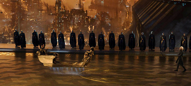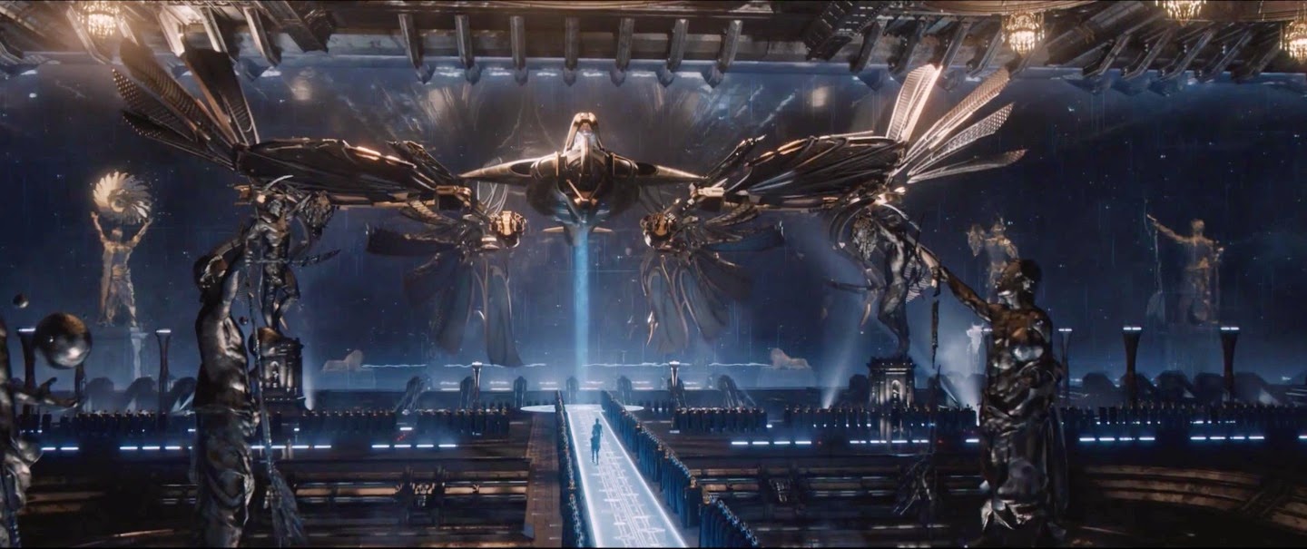 Con el fin de que Jupiter pueda reclamar su derecho sobre la Tierra, es forzada a ir al espantoso planeta Orus y pasar por un proceso de registro de su título. Suena como la base de la sociedad actual de la Tierra. Ella atraviesa varias ventanas acompañada de un ‘abogado androide’ hasta que se le graba un tatuaje en su muñeca (microchip) y se le permite oficialmente reclamar la propiedad de la Tierra. Suena simple, no? Los androides hacen su aparición en Orus y son los oficiantes del ‘sistema’, tema que impregna muchas otras narrativas de ciencia ficción. Ver Elysium y la película de esta primavera titulada Chappie. La proyección de imágenes que relaciona la ‘conciencia robotoide’ actuando como salvadores, ha alcanzado tal punto que supongo llegará el momento de encontrar policías robots/ejércitos en mi lapso de vida.
