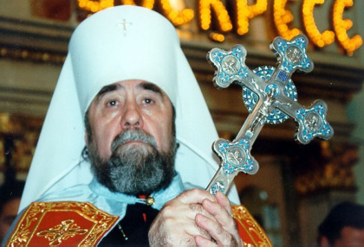 Un sacerdote católico ortodoxo, sostiene una cruz de lo oculto. Con cuidado, observe el cráneo y el emblema de los huesos.